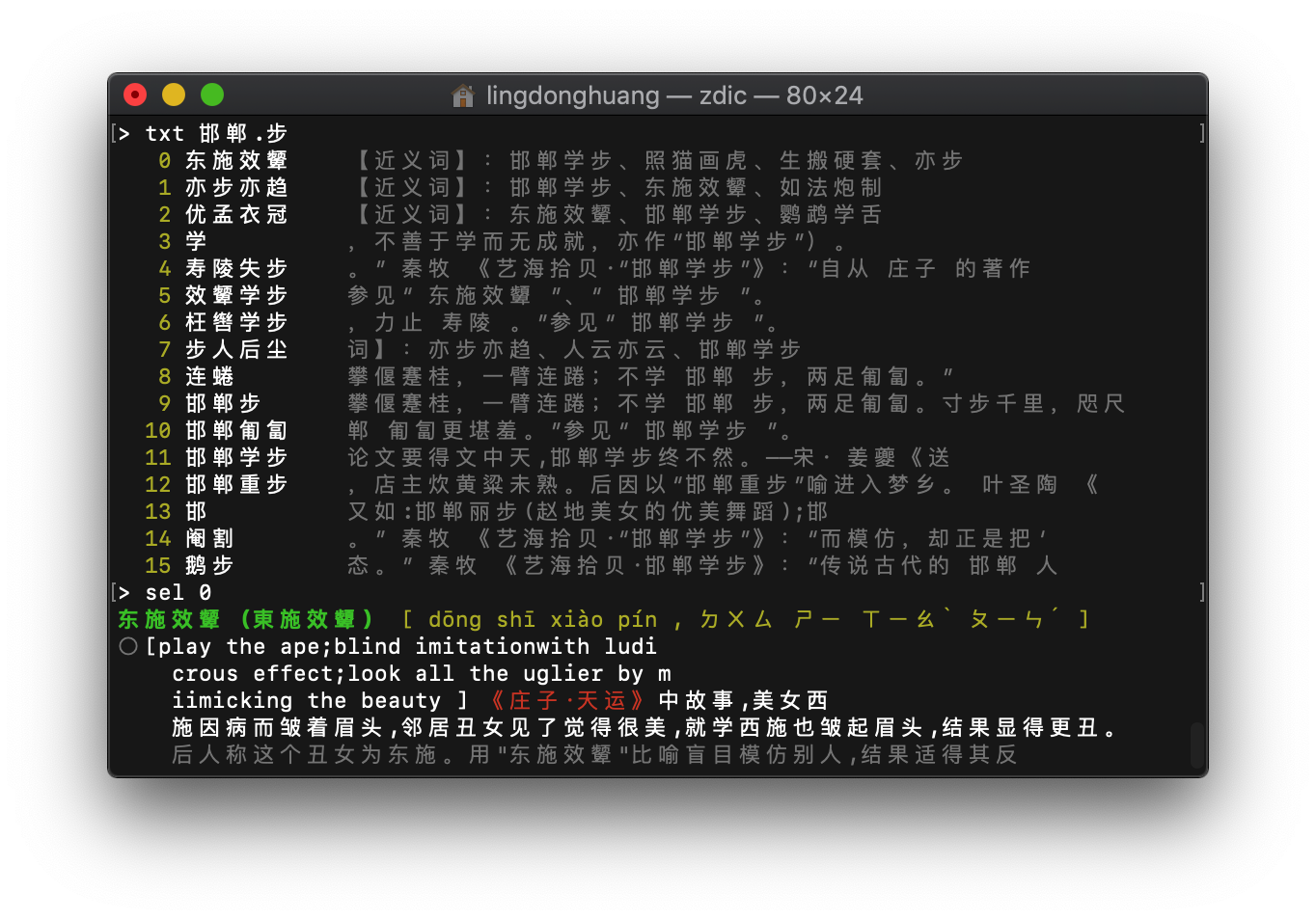 zdic-cli runs as a REPL loop, and there are 5 types of commands you can enter: