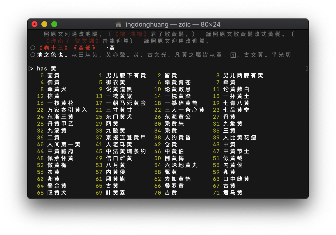 An alternative, offline, regex-supporting, command-line interface to zdic (漢典), featuring: